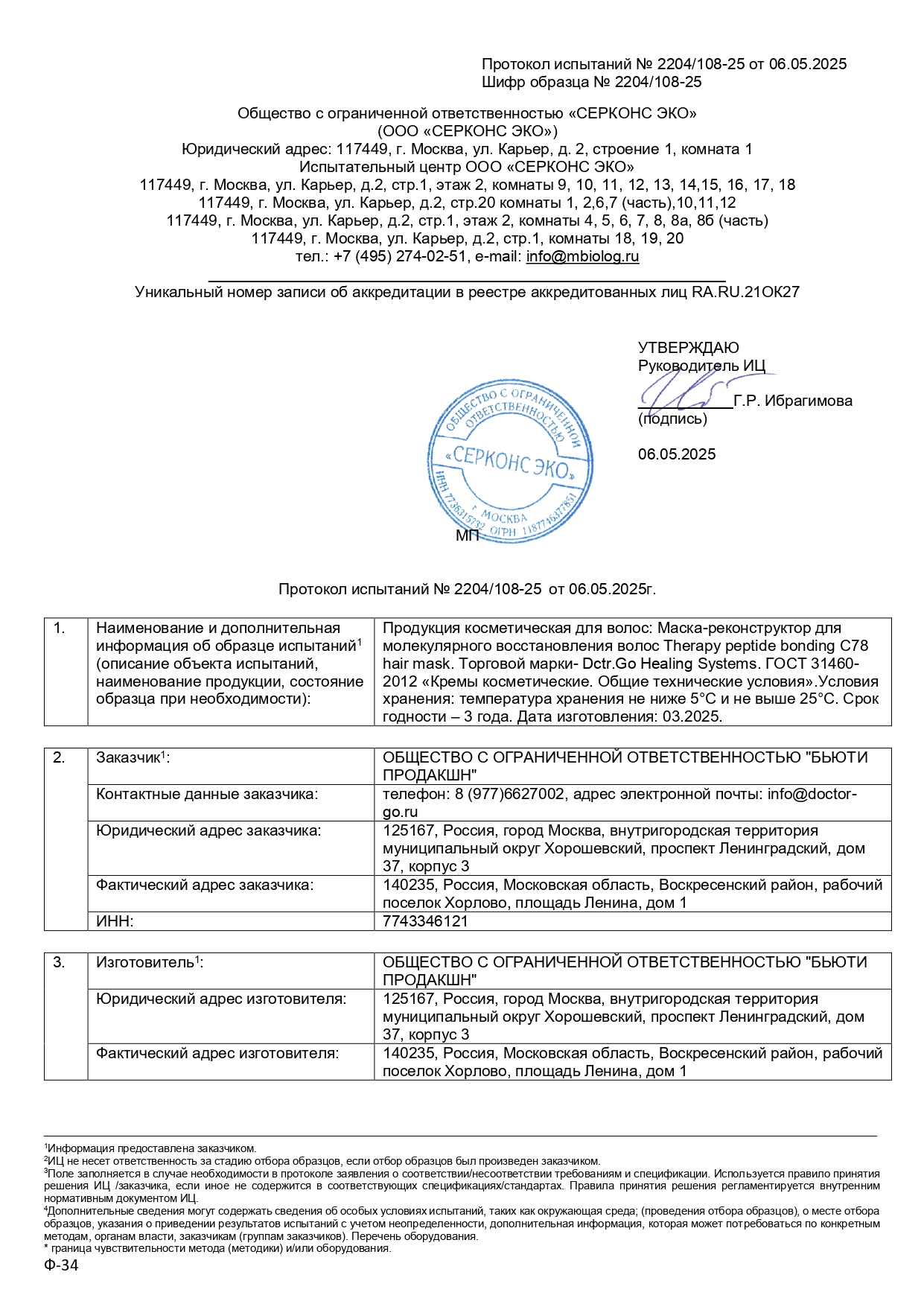 Вложимость в коробках (кол-во шт в 1 коробке): 20 Анонс: Супер ХИТ! код ТН ВЭД: 3305900009 Бренд: DctrGo Healing Systems Вес: 0,05 Производитель: ООО Бьюти продакшн Страна производитель: Россия Тип упаковки: Ваакумный диспенсер Сезон: Всесезонный продукт Год создания: 2024 Нишевая парфюмерия: Tiziana Terenzi Kirke Extrait de Parfum Название модели: Peptide Bonding 78 Класс опасности товара: не опасен Пол: унисекс Область использования: Москва Эффект: Молекулярное восстановление Тип волос: Для всех типов волос Единиц в одном товаре: 1 Условия хранения: от +5 до + 25 Способ применения: Нанести на влажные волосы после шампуня Срок годности: 36 мес - 2 отзыва к товару Несмываемая маска для восстановления волос после окрашивания и осветления Therapy peptide bonding C78 hair mask в Орле